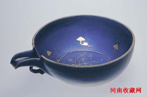 该器仿青铜匜,造型秀美,蓝釉深沉厚润,闪烁着宝石蓝般的光泽,配以熠熠生辉的金彩,光彩夺目,华美异常。这件蓝釉描金匜1964年出土于河北省保定窖藏,同时出土的还有蓝釉描金小杯和盘,此匜的金色花纹丝毫无损,光艳如新,实属罕见。