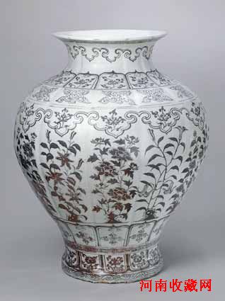 尊石榴形,撇口,短颈,丰肩,肩下渐敛,通体起瓜棱。外壁釉里红纹饰,共10层。口沿饰回纹一周,其下饰如意头纹。肩部纹饰顺序为变形莲瓣纹内绘折枝花,变形云头纹,如意头纹内绘折枝花。腹部绘四季花卉12组,均配以湖石。腹下饰变形莲瓣纹内绘朵花,胫部饰回纹一周。足上饰变形莲瓣纹内绘折枝花,足边饰卷草纹。底无釉无款。