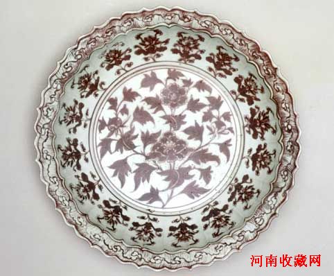 明洪武釉里红器装饰以植物题材为主,其植物种类之繁多,内容之新奇,是以前各时期所无法比拟的。这件洪武釉里红大盘纹饰富丽多彩,釉面发色纯正鲜艳,较好地体现了明初釉里红的烧制成就,在品种、数量都不甚多的明初釉里红器中堪称珍品。