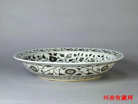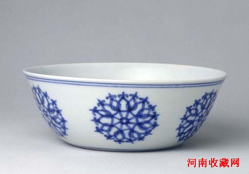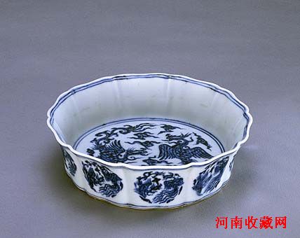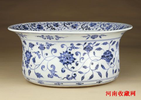 此盆青花呈色浓艳,有晕散现象,为苏泥勃青料所致。纹饰繁复生动,层次分明,是永乐时期受西亚国家金银器的影响而创烧的一种新器型。