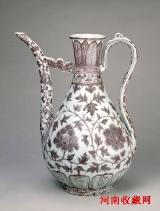 明洪武时期的釉里红瓷器多为大盘、大碗、大罐、玉壶春瓶、梅瓶、执壶等大件器物,纹饰以各种缠枝、折枝和串枝花卉为主,此外还有松竹梅、庭院芭蕉及龙凤等纹饰。此时期的釉里红发色不甚鲜艳,多为红中偏灰黑的色调,此壶发色较为鲜艳纯正,是一件难得的珍品。