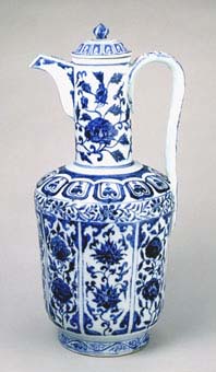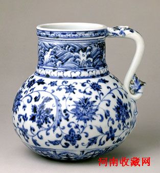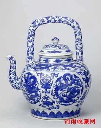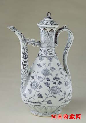 此花浇青花色泽浓艳,有黑色结晶斑。其造型风格系仿西亚黄铜壶器物。