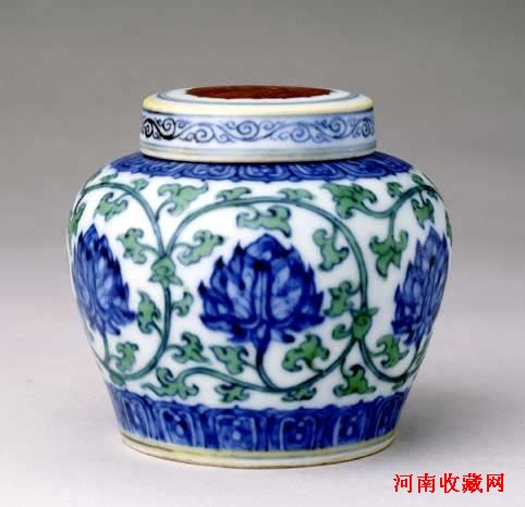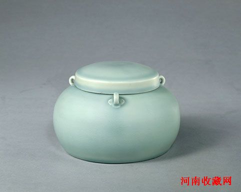 罐直口,扁腹,圈足。肩部有3个环形小系,系下凸起海棠托饰,花瓣上有横线纹。罐里及足内施青白釉,外施翠青釉。直口盖合于罐口。此罐制作规整,胎体细腻,釉色青翠。翠青釉瓷器为永乐时所创,传世品极少。