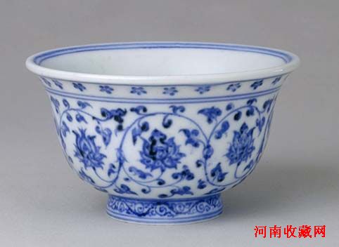 明永乐青花压手杯是明代瓷器中能与文献记载相互印证的一种实物,具有重要的历史研究价值。明人谷应泰撰写的《博物要览》一书中特别提到了这种杯:“永乐年造压手杯,坦口,折腰,砂足滑底。中心画有双狮滚球,球内篆书‘大明永乐年制’六字或四字,细若米粒,此为上品,鸳鸯心者次之,花心者又次之也。杯外青花深翠,式样精妙,传世可久,价亦甚高。”在故宫博物院的藏品中,有双狮绣球内书年款和花心内书年款的压手杯,另有杯心为鸳鸯卧莲图案者,系万历时期仿制。此种精致高雅且带有永乐年款的压手杯,据目前掌握的资料来看,仅故宫博物院收藏有三件。