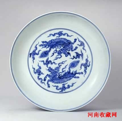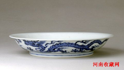盘撇口,弧壁,圈足。盘内壁与内底交接处暗划弦纹一周。内底暗划云纹三朵,呈“品”字形排列。内壁模印云龙纹。外壁以青花绘二云龙赶珠纹。足内施白釉,无款识。