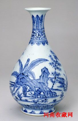 瓶撇口,细颈,硕腹,圈足。底足无釉无款识。通体在莹润闪青的白釉上展现出色泽浓艳的青花纹饰。瓶颈部绘三层纹饰各一周,上部为上仰的蕉叶纹,中间是缠枝花纹,下部为下垂的云头纹,近足处绘上仰变形蕉叶纹一周与之相呼应。足外墙饰一周半朵莲的边饰。腹部为主题纹饰:运用写实的手法描绘出一幅南国的庭院景致,图中两块玲珑的湖石挺拔俊秀,依石而立的翠竹枝头微低,似在随风摇曳,围栏内外一片郁郁葱葱的萱草、兰花竞相开放,呈现出一幅生机勃勃的景象,而四季常青的芭蕉叶又为画面平添了几分南国色彩。山石、翠竹、蕉叶、萱草、兰花构成了一幅寓意吉祥的“五瑞图”。