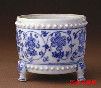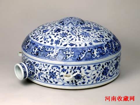 此器在宣德青花中极为少见,其造型、花纹均充满宗教仪式的含义,当为佛教徒作道场时所用的法器,是景德镇专为宫廷烧制的佛事用具。