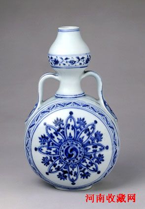 青花双耳葫芦式扁瓶,明永乐,高25.2cm,口径3.3cm,足径6cm