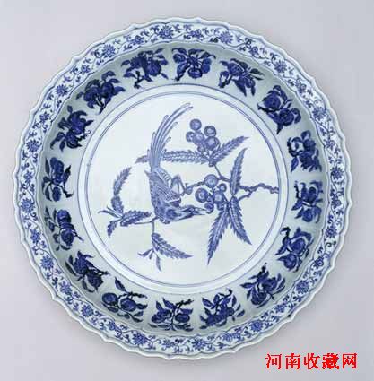 永乐、宣德两朝是我国青花瓷器史上的黄金时代,其青花瓷之胎质、底釉、绘画,无一不精。此盘使用永乐时由西洋进口的“苏泥勃青”料,浓重艳丽,渗入胎骨,并有自然晕散形成的“铁锈斑”,手抚之有凹凸不平之感。国内外现存传世的永乐青花瓷,大盘往往以花卉为装饰题材,用枇杷绶带鸟为主题图案的较少见,就目前已掌握的资料来看,完整的只有三件:日本东京国立美术馆一件,天津艺术博物馆一件,而北京故宫博物院现存的这件最为精美。