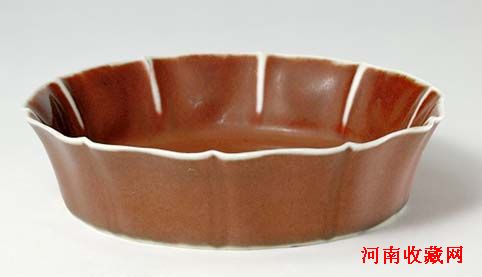 洗通体作十瓣菱花式,敞口,浅身,腹壁近直,平底。通体施鲜红釉,釉面匀净,色鲜艳。口沿与腹壁花瓣出筋处显露洁白的胎色,与器身的红釉相映生辉。底施白釉,无款。