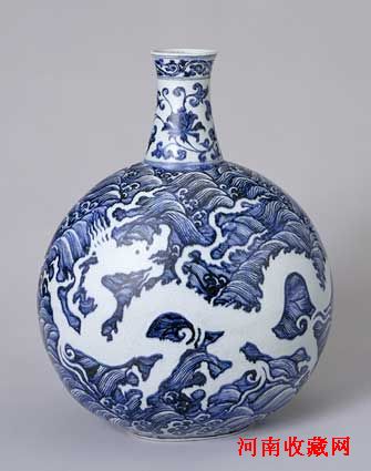 瓶圆口,口边微外侈,长颈自上而下渐阔,扁圆式腹,椭圆形浅圈足。通体青花为饰,瓶口及颈部绘卷草纹和缠枝莲纹各一周。腹部为青花留白海水龙纹,一条矫健威猛的白龙在苍茫无际的大海中遨游,白龙回首曲体,须发飘扬,四肢伸张,呼之欲出。青白相间的波涛上下翻滚,汹涌澎湃,又见点点黑斑,大有铺天盖地、水珠激溅、迎面而来之感。尤其是以青花点白龙双睛,愈显神采。