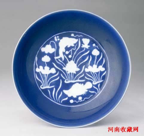 此盘器型规整,胎体厚重,蓝釉厚润莹亮,白釉鱼莲纹刻画得精美生动,既有天然意趣,又富装饰美感。鱼纹是我国传统的工艺装饰题材,由于“鱼”“余”谐音,因而民间有“连年有余(鱼)”、“宝贵有余”等吉语。