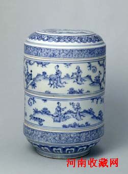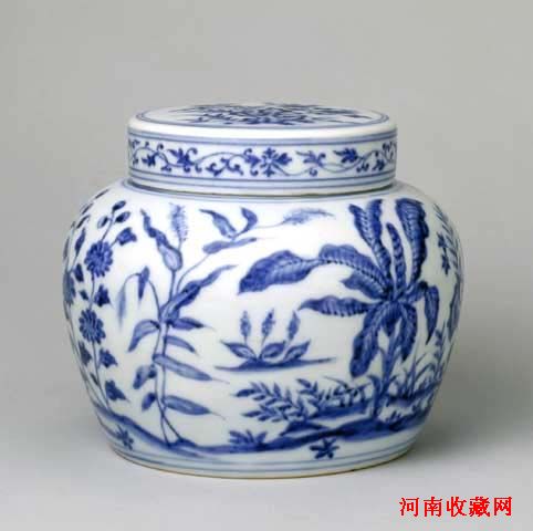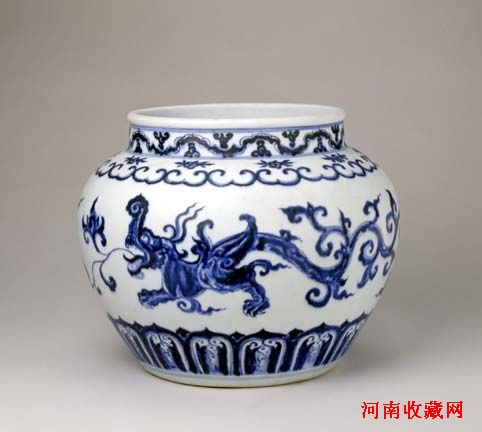 此罐造型浑厚雄伟,构图繁密严谨,层次分明,主题突出。据文献记载,此时期的青花瓷使用回青料描绘,色调翠蓝浓艳,微泛紫红色,具有鲜明的时代特征。