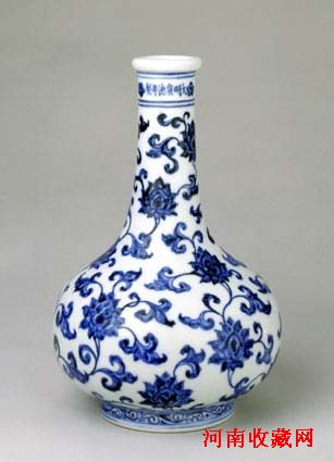 瓶直口,长颈,硕圆腹,平底。颈部为缠枝莲纹,绘上仰变形如意头纹一周,纹内绘花蕾。腹部为缠枝花卉纹饰。素底无釉。