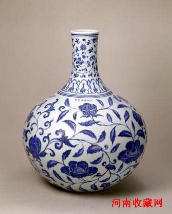 明代是中国古代青花瓷器生产的黄金时期,青花瓷作为瓷器生产的主流亦在宣德朝达到了其制作的顶峰。宣德年间使用的青料,大部分是进口钴料,即所谓“苏泥勃青”料。因含铁量高,含锰量低,在适当的火候下,能烧出像蓝宝石一样鲜艳的色泽,且烧成后往往在青花部分会出现有金属光泽的黑色斑点,形成宣德青花瓷器的重要特征。这件宣德青花天球瓶的青花色泽与一般宣德青花发色不同,从其发色清淡的呈色效果上看,宣德青花器并不全都使用进口钴料,也还使用部分国产青料。其纹饰题材以花卉瓜果为主,云龙海水为辅,构成了四季鲜花竟相开放,四时瓜果同时飘香的独特风格。石榴花、菊花、莲花、牡丹、百合、茶花、宝相花、牵牛花、射干花等较为常见。每件器物多以偶数种类的花卉,通过不同形式组合在一起,形成变化丰富的花纹装饰。反映了明代瓷器装饰所取得的艺术成就。