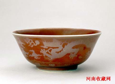 碗撇口,弧腹,高圈足微外撇。碗外壁及足满施鲜艳的宝石红釉,内壁为白釉,有暗云龙纹装饰。碗心暗刻篆书“永乐年制”四字款。