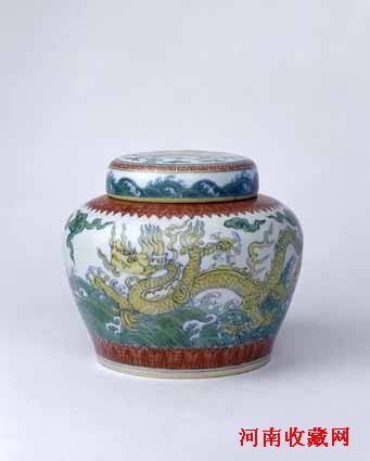 罐直口,短颈,丰肩,瘦底,圈足。其通体以青花加红、黄、绿彩装饰,颈部绘如意头纹6组,肩部绘变形莲瓣纹一周,罐身绘云鹤穿花及八宝纹,近足处绘变形蕉叶纹一周,底青花双圈内楷书“大明嘉靖年制”双行六字款。