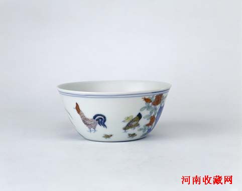 此碗所施白釉莹润泛青,青花发色浓重艳丽,所用青料当系嘉靖朝盛行的“回青”。所绘三羊图案为吉祥图案,寓意“三羊开泰”。“三羊开泰”谐音“三阳开泰”,“三阳开泰”本意是《周易》的“泰”卦,为最吉利的一卦,是以三阳爻开始的,象为,其意之所以吉利,是因其寓意“天地交而万类通,上下交而其志同。”