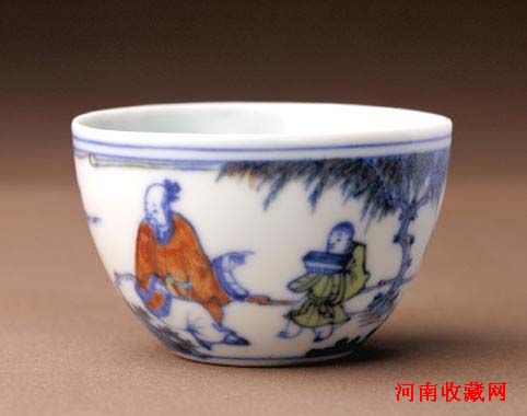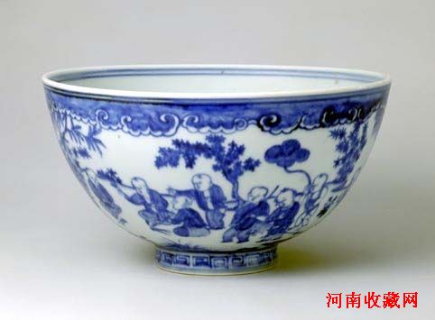 明宣德青花使用进口青料,此种高铁低锰料在烧成过程中青料易晕散,故所绘纹饰不够清晰。此碗青色较为淡雅,纹饰比较清晰,实为难得。其云气纹用粗、细线勾画轮廓,此画法对后世瓷器纹饰亦有影响。明宣德时陶瓷器物中以人物纹为题材者较为少见,故此碗为宣德时期人物纹器物的代表作品。