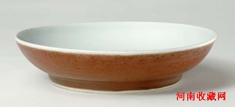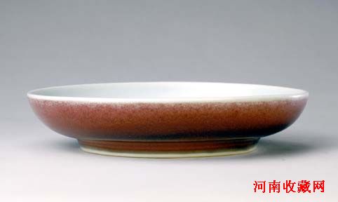 盘浅式,敞口,圈足。里白釉无纹饰,外施红釉,足内白釉闪青,无款识。