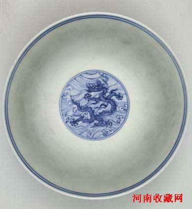 此盘胎薄体轻,造型优美,青花发色艳丽,所绘龙纹笔触细腻,生动传神。盘内印、划花纹承袭了元代及明洪武瓷器的作法,反映了景德镇窑瓷器从元至明永乐朝一脉相承之关系。