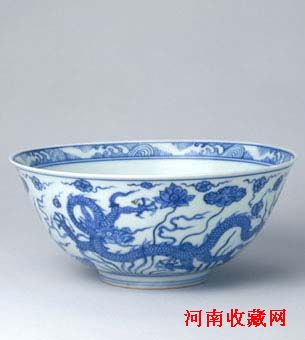 宣德时期,有“诸料悉备,青花为贵”之说。此瓶的装饰过程是先在瓷坯上以尖状工具勾划龙纹轮廓及龙之双目、冠发、厚唇、牙齿、爪趾、鳞等细部,然后在龙身周围用青花料满绘波涛汹涌的海水并施透明釉,入窑高温烧成。