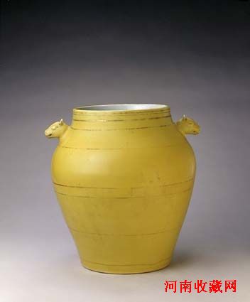 此罐以舒缓的曲线构成丰满匀称的形体,体虽硕大,却无笨拙之感,古朴中透出俊秀之美。罐上所施黄釉色泽淡雅,浑然一色,描金弦纹熠熠生辉,装饰效果高贵典雅。