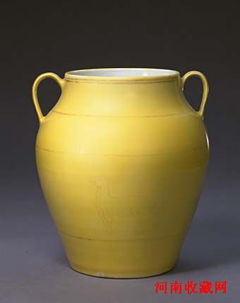 我国传统低温黄釉瓷器以明弘治时产品最负盛誉。由于弘治黄釉瓷器一般用“浇釉”的方法施釉,故有“浇黄”之称,又因其黄色浅淡娇嫩,故亦称“娇黄”。明代黄釉瓷器以盘、碗居多,黄釉描金罐唯弘治朝有。此类黄釉描金罐除置曲带式耳者外,尚有置兽耳者,也有不置耳的,均属宫廷祭祀用器。其传世品多属清宫旧藏。