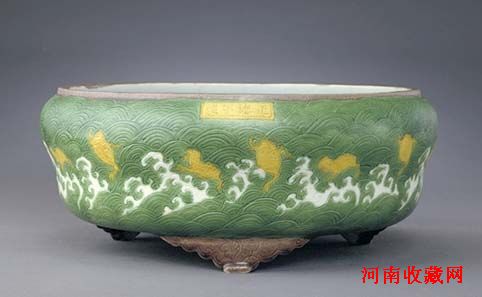 洗口内敛,平底,下承三如意头式足,口沿黄彩暗刻楷书“正德年制”四字款,内施青白釉,外壁刻划16个海中嬉游的蟾蜍,纹饰构图简练。以黄彩绘蟾蜍,绿彩绘海水,白彩绘浪花,紫彩涂口、足,色彩和谐分明,清爽悦目。传世的正德素三彩已屈指可数,这件洗可谓是稀世珍品。