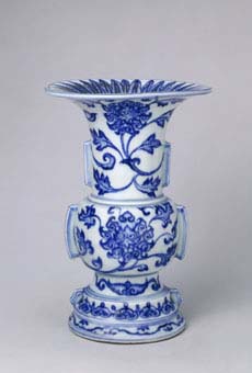 出戟尊仿铜器式样烧制,宋代钧、官二窑均有此类制品,明代青花承袭这一传统造型,自明中期至万历时期烧造数量大为增多,造型变化也最明显。