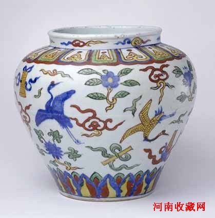 五彩云鹤纹罐色彩浓艳,画迹工整,是典型的官窑作品。主题纹饰以云鹤为主,充满神秘的道教色彩,反映出当时皇宫中崇尚道教之风。