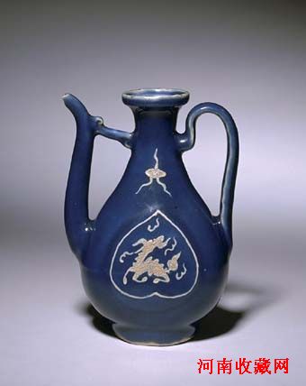 壶盘口,细颈,扁圆腹,弧形流,曲柄,圈足。壶内壁施白釉,外壁施蓝釉,蓝釉色泽沉稳幽暗。颈部刻朵云纹,腹部桃形开光内刻麒麟云纹,蓝色釉地衬托出褐色的纹饰,颇具立体效果。