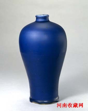 瓶小口,短颈,丰肩,肩以下渐广至腹部内敛,圈足。通体施高温霁蓝釉,近底处由于积釉较厚呈紫黑色。足内无釉露胎。