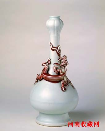 白釉塑贴红蟠螭纹蒜头瓶,明嘉靖,景德镇窑制品,高30cm,口径2.6cm,足径10cm。清宫旧藏