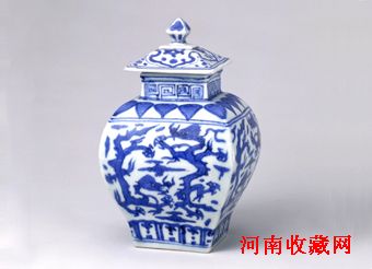 罐四方形,有盖。盖面饰如意云纹,罐颈饰回纹,肩部为蕉叶纹,腹部四面分别绘双云龙纹,足边为变形莲瓣纹。底青花双方栏内书“大明嘉靖年制”双行六字楷书款。