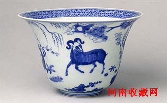此碗是一件明代嘉靖年间景德镇御窑厂烧造的宫廷用瓷器。碗呈仰钟式,内外均为青花装饰。碗心绘麒麟,辅以松、石、花草。碗内近口沿处绘锦纹。外壁绘神态各异的三羊,一羊正面伫立,一羊侧面作行走状,一羊回首观望。三羊间衬以松、竹、梅及杨柳、芭蕉。外底署青花“大明嘉靖年制”六字双行款,外围双圈。