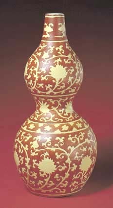 瓶为葫芦形,上小下大,直口,溜肩,束腰,双鼓腹,圈足。通体黄釉红彩划花装饰,口部为朵云纹,上下二段主题纹饰绘缠枝莲花,上为四朵,下为二朵,束腰处绘缠枝灵芝纹。自上至下有六道弦纹,把纹饰分为五层。其作法是先烧成黄釉暗花,然后用矾红彩涂色地,托出黄色的主题花纹,色调对比艳丽。这种“黄上红”技法为嘉靖时期专用,后世少有仿作。此瓶足内白地青花双圈内书“大明嘉靖年制”六字款。