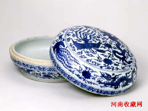 盒扁圆形,盒盖平顶微隆,子母口,圈足。盖面绘青花龙凤穿枝花纹。盖、盒外壁亦绘龙凤穿枝花纹,盖、盒口沿绘卷草纹,上下呼应,各组纹饰间以双弦纹相隔。足内青花双圈内署“大明隆庆年造”六字款,隆庆时期款识书“造”而不书“制”,成为一明显的时代特征。