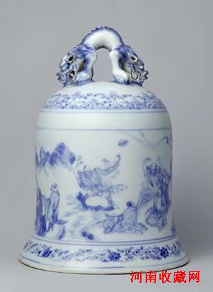 明天启朝历时仅7年,传世品数量极少,此件带有明确纪年款的青花钟实属罕见珍品。此钟形制系模仿周代青铜打击乐器中的青铜钟。其造型秀丽,线条圆滑流畅,龙头钮设计巧妙,使精巧的瓷钟平添几分庄重气派。钟体洁白莹润的釉面上,以工整细腻的淡描青花描绘十八罗汉图,画中人物或卧或立,各持法器,各显神通,形象鲜明生动。此钟在天启青花大多画意粗率的器物中堪称精美之作。