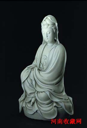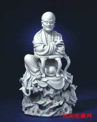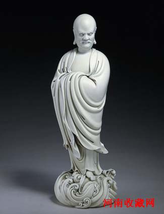 明代德化窑烧造的瓷雕久负盛名,尤以“何朝宗”款最为著名。此像雕刻精湛细腻,线条流畅,更兼以洁白如玉的瓷质,表现出达摩飘洋过海传播佛法的高僧形象,是德化窑之佳作。