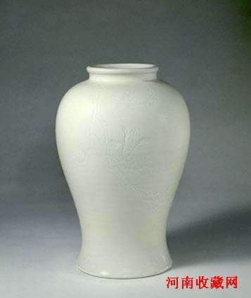 尊广口,圆唇,短颈,丰肩,肩下渐收敛,圈足浅而宽,略向外撇。通体施乳白色釉,俗称猪油白。外壁暗刻玉兰两枝,或含苞,或怒放。