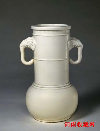尊广口,方唇,粗长颈,颈上置对称象耳,圆腹,圈足。通体施白釉,口沿下印回纹一周,颈、肩处有数道凸起的弦纹。