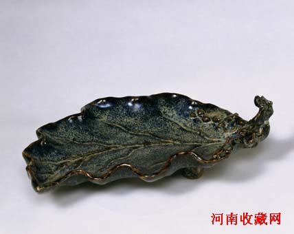 洗通体仿楸叶形,内外雕刻凹凸的叶脉,叶边堆贴4朵盛开的花,并刻出7枚花蕾。胎体厚重,釉层凝厚,深蓝色釉中渗化出葱白色雨点状花斑。此洗造型新颖,窑变花釉挥洒自如,卷曲的叶边仿佛被微风吹动,颇有天然韵致。
