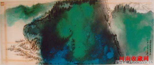 五幅作品中有两幅是泼墨泼彩山水画,一幅《晓霭》作于1975年,另一幅《山路元无雨》作于1977年。张大千的泼墨泼彩不仅是描写大自然境象的张本,也凝聚着他内心情感的波动,在作画时他往往通过诗意来获取创作的灵感和源泉,如这幅《山路元无雨》表达的就是唐代诗人王维《山中》一诗的意境。“山路元无雨,空翠湿人衣”说的是初冬时节的深山天寒风冷,氤氲的雾气与终年长青的苍松翠柏相互环绕宛如一片流淌的绿云。行在山间小路上,周身被空明的翠色笼罩,那灵动的绿云好似幻作绿水洒落,虽未下雨,却已有襟背沾湿的感觉。王维的诗意境虽美,但只可意会不可言传,而张大千却实实在在地铺陈了一幅明秀清润的山中初冬风景画,这画面极具冬的情韵,却无冬的肃杀,处处显露着生机与活力,让观者仿佛置身其中。此画长185厘米,宽75厘米,题跋为“山路元无雨,空翠湿人衣 六十六年夏爰画”,钤“张爰私印”、“大千”印。