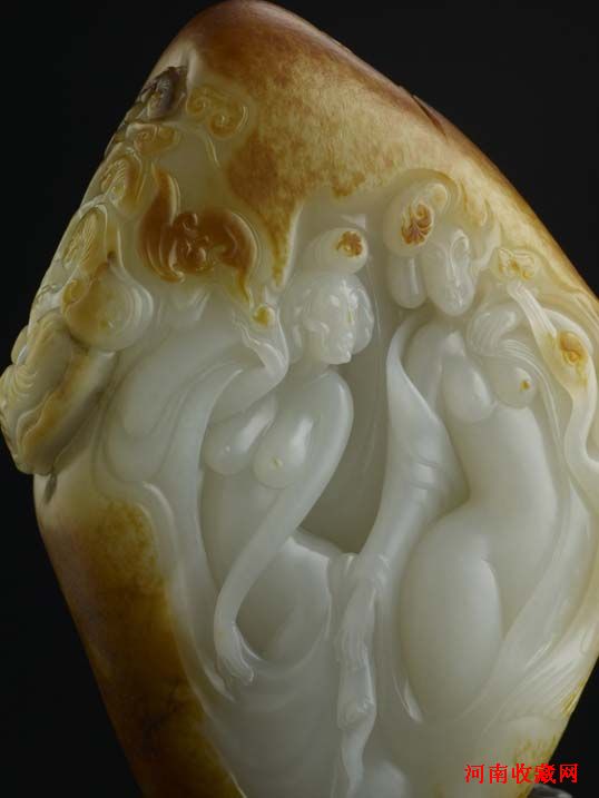 另一件由吴德升大师创作的《双娇》重达1260克,作品人物以S型造型表现,人体夸张生动,结构准确,用长而柔缓的线条处理,流畅舒展,使人物更加柔美。作品大面积的保留原料的皮色,极力保存珍惜的材料,突出材料的原生态之美。中国玉雕大师吴德升先生在“仕女”玉雕题材的创作上,独树一帜。他汲取西方人体雕塑美学的丰富营养,将现代雕塑表现形式与传统玉雕融合在一起,从中既有传统玉雕的表现手法,又具有雕塑作品的写实张力。