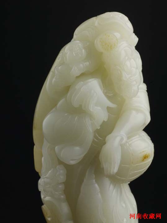 《加官晋爵》为崔磊大师的一件力作,作品所选玉料,玉质肥润,白洁细腻,作者借皮色处为冠帽,圆雕人物,形貌憨态可掬,虬髯飞扬,笑口常开,颇有福相。作品整体饱满圆润,人物刻画生动,刀法大气,刚柔相济,抑扬顿挫,收放自如。