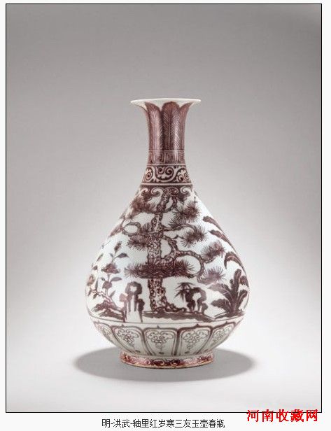 洪武釉里红的烧制达到了有明一代的最高水平,价格高于同时代的其他彩瓷品种。玫茵堂旧藏明洪武釉里红开光式寿鞠图棱口折沿大盘,口径45.5厘米,以4098万港币拍出,这是继明洪武釉里红缠枝牡丹纹玉壶春瓶之后,洪武釉里红创造的第二高价。北京匡时也成交两件洪武釉里红瓷器,春拍中明洪武釉里红岁寒三友玉壶春瓶2760万元拍出(图19)。值得一提的是,北京永乐春拍一对明洪武白釉模印龙纹盘以67.2万元拍出,对碗直径15.2厘米,1995年10月在北京翰海秋拍以41.8万元释出,碗的模印方法源自元代景德镇枢府瓷。