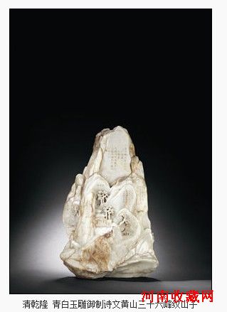 清乾隆<青白玉雕御制诗文黄山三十六峰纹山子>颇为引人注目,此玉山子皮色红褐,光泽柔和,包浆古雅,随形留皮而雕,利用玉料圆雕山势重叠,壁崖料峭,制玉者随料之势琢黄山美景及嶙峋山岩,藏青松、寺庙于山岩之间,显出深浅不同的层次,颇富立体感。玉面附乾隆御题诗之黄山三十六峰(赠康熙皇二十一子慎郡王允禧),乾隆帝精通诗文,长于古物鉴赏,常在他鉴赏过的器物上写、刻御题诗文或跋文,尽显其儒雅之气。旧配雕花木座。