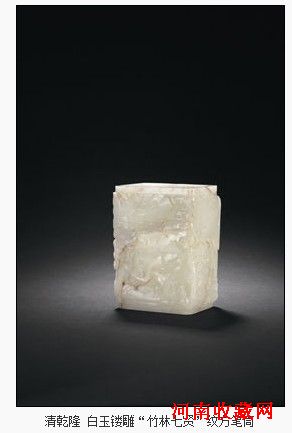 此外,一件清乾隆<白玉镂雕“竹林七贤”纹方笔筒>,堪称文房雅玩之佳器。品味此笔筒,其通景图案的设计布局、刀法之刻划均融以画意,选材经典,制作谨严,气韵恢弘,文人品味与宫廷风格集于一身。此笔筒为白玉质,方口、下承圈足。工艺繁杂,雕刻精湛,将传统圆雕、镂雕及阴刻等各种工艺结合运用,镂雕松石楼阁互相辉映,山势重叠,峰峦起伏,古松挺拔,竹林隐映,山边溪水潺潺,祥云萦绕,恍若仙境。林中七贤士姿态各异,或对面论诗,或提笔做诗,或携琴而立。更有童子嬉戏,烹茶煮茗,不亦乐乎。整图雕琢层次分明,刀法坚实有力,线条流畅繁复而不杂乱,构图繁密,意境典雅古朴。