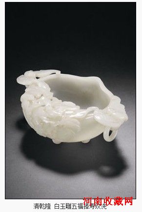 另有一件,清乾隆<白玉雕五福捧寿纹洗>。此洗以和田白玉为料,器呈桃形,底出四足。洗内挖膛,抛光细致。器身藤枝蔓蔓,枝叶缠绕,周身浮雕五只硕大蝙蝠,遥相呼应。在中国的传统文化中,蝙蝠是好运和幸福的象征。人们经常说的“五福(蝠)临门”, 就由那五只蝙蝠组成。此水洗的玉质圆润光洁,用料硕大,刀工简洁利落,棱角分明,端庄肃整,颇具古风。既可用来文房盛水洗笔,也是一件精美的案头陈设。